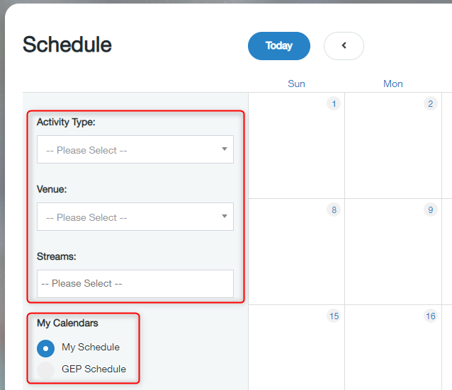 - This will then automatically show ‘My Schedule’ which will display all the activities you have been registered to. View all GEP activities by clicking ‘GEP Schedule’. You can filter the calendar using the filters available