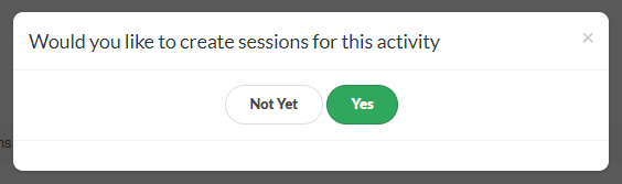 - A pop up will then appear asking ‘Would you like to create sessions for this activity’ you need to click ‘Yes’ to add sessions now or ‘Not Yet’ if you wish to add them in the future