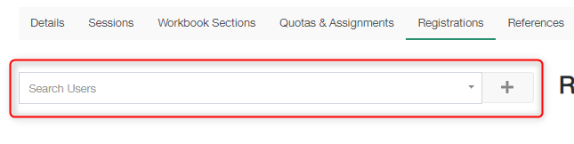- Register delegates to the Activity by clicking the ‘Registrations’ Tab on the top menu, and searching for the delegates in the ‘Search Users’ box once you have found them click ‘+’