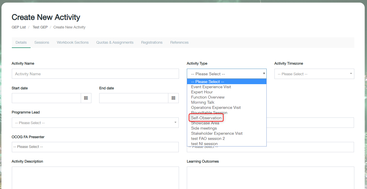 - Complete the required field and under Activity Type you need to select ‘Self-Observation Activity’